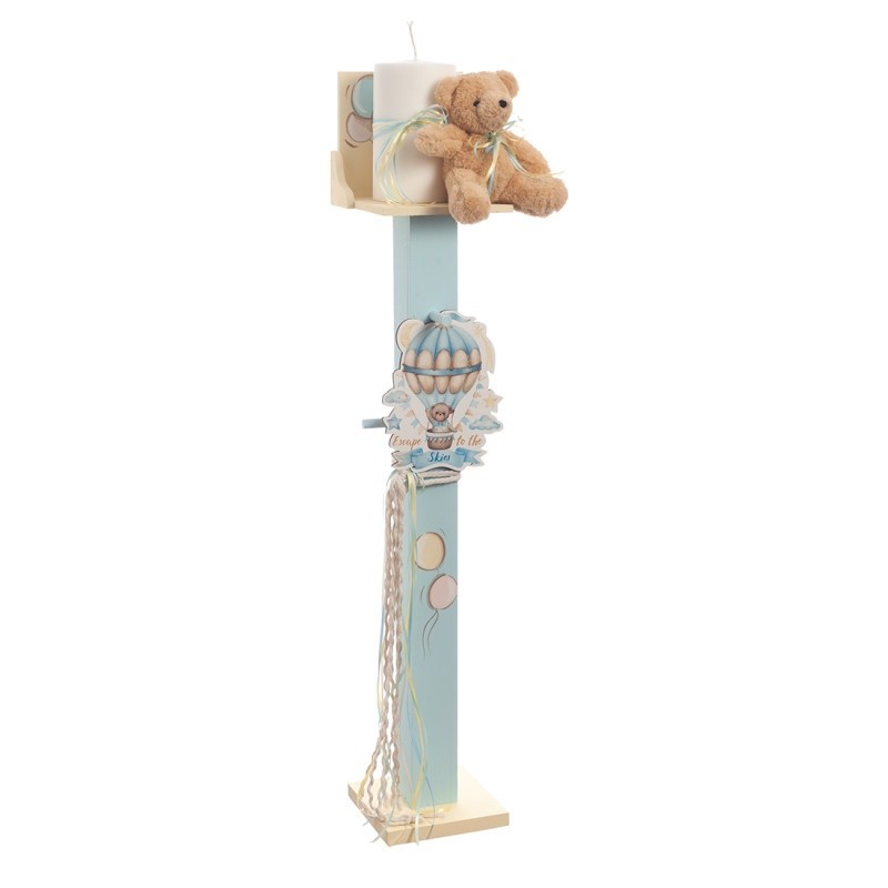 • Κρεμάστρα-Λαμπάδα Βάπτισης. Ξύλινος κηροστάτης κρεμάστρα σε σιέλ και κίτρινο χρώμα. Είναι διακοσμημένος με ξύλινο κοπτικό αερόστατο και λούτρινο αρκουδάκι. Στην τιμή περιλαμβάνεται και το κερί για την εκκλησία. Βάση: 16 x 16 cm, Ύψος: 93 cm, Βάση για κερί: 16 x 15,5 cm.