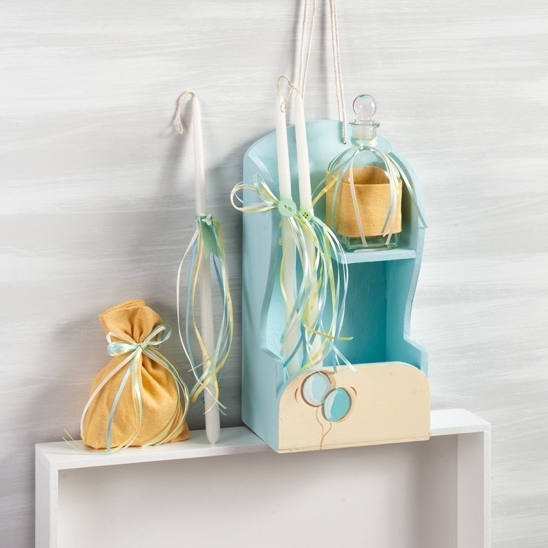 • Ξύλινο ράφι λαδικών σε σιέλ-κίτρινο χρώμα και ζωγραφισμένο με μπαλόνια. Ο κωδικός περιλαμβάνει στολισμένα 3 κεράκια, σαπούνι μέσα σε πουγκί και μπουκαλάκι λαδιού. Διάστ.: 20x12x34cm