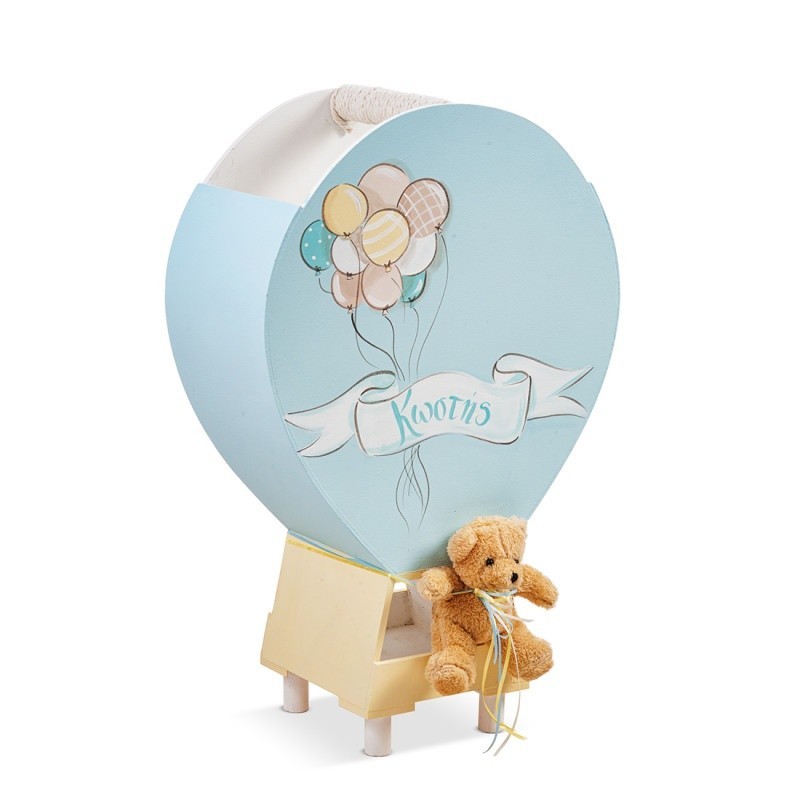 • Ξύλινο κουτί βαπτιστικών αερόστατο. Το κουτί είναι βαμμένο σε σιέλ και κίτρινο χρώμα. Στο επάνω μέρος είναι ζωγραφισμένο ένα μπουκέτο από μπαλόνια και μία κορδέλα με το όνομα του παιδιού. Το κάτω μέρος είναι διακοσμημένο με λούτρινο αρκουδάκι. Διάστ.: 46x24x73cm