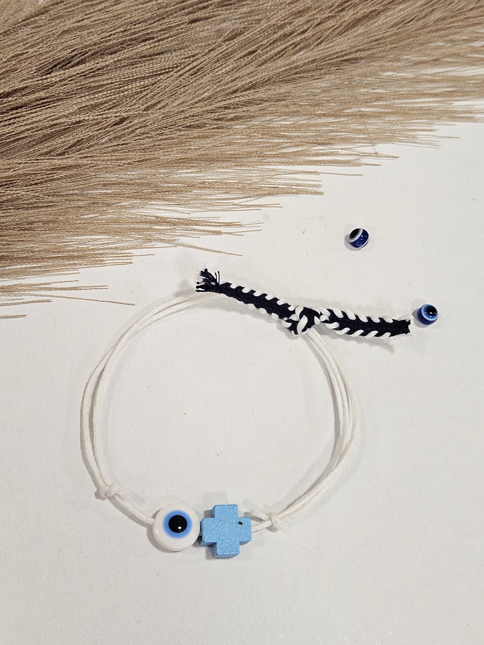 🔸 Σχέδιο: Βραχιόλι με ματάκι, γαλάζιο σταυρό και κορδέλα σε σκούρο μπλε με άσπρες λεπτομέρειες,