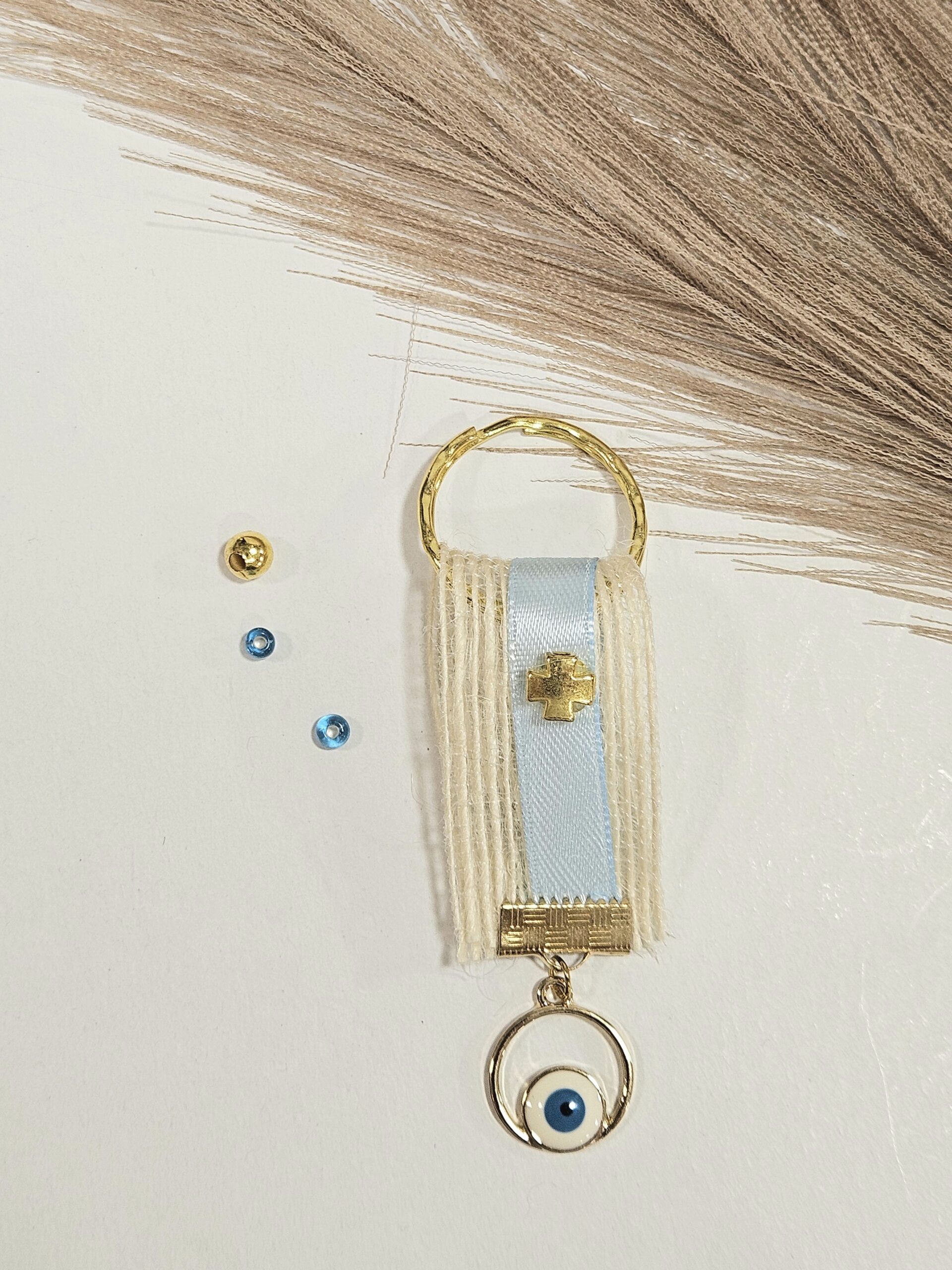 🔸 Σχέδιο: Μπρελόκ με γαλάζιο ματάκι, υφασμάτινες κορδέλες σε συνδυασμό κι επιχρυσωμένος σταυρός στο κέντρο