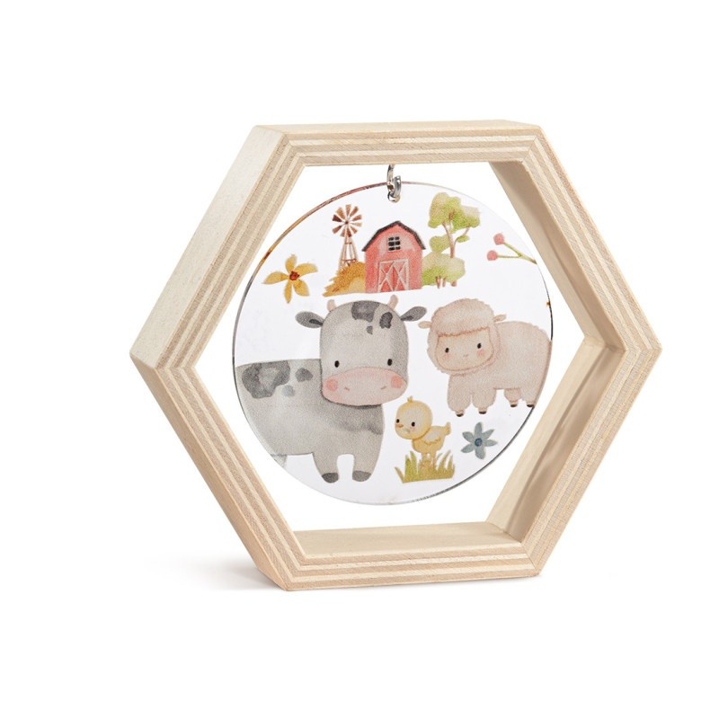 Ξύλινο διακοσμητικό σε σχήμα πολύγωνο.Το καδράκι είναι διακοσμημένο με στρογγυλή print plexiglass παράσταση σε διάφανο χρώμα.Η παράσταση απεικονίζει την φάρμα των ζώων.