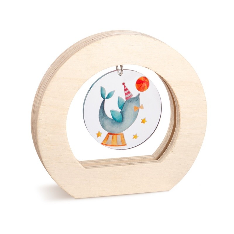 Ξύλινο οβάλ καδράκι σε natural χρώμα. Το εσωτερικό είναι διακοσμημένο με κρεμαστή plexiglass print παράσταση σε στρογγυλό σχήμα με θέμα το δελφίνι στο τσίρκο.