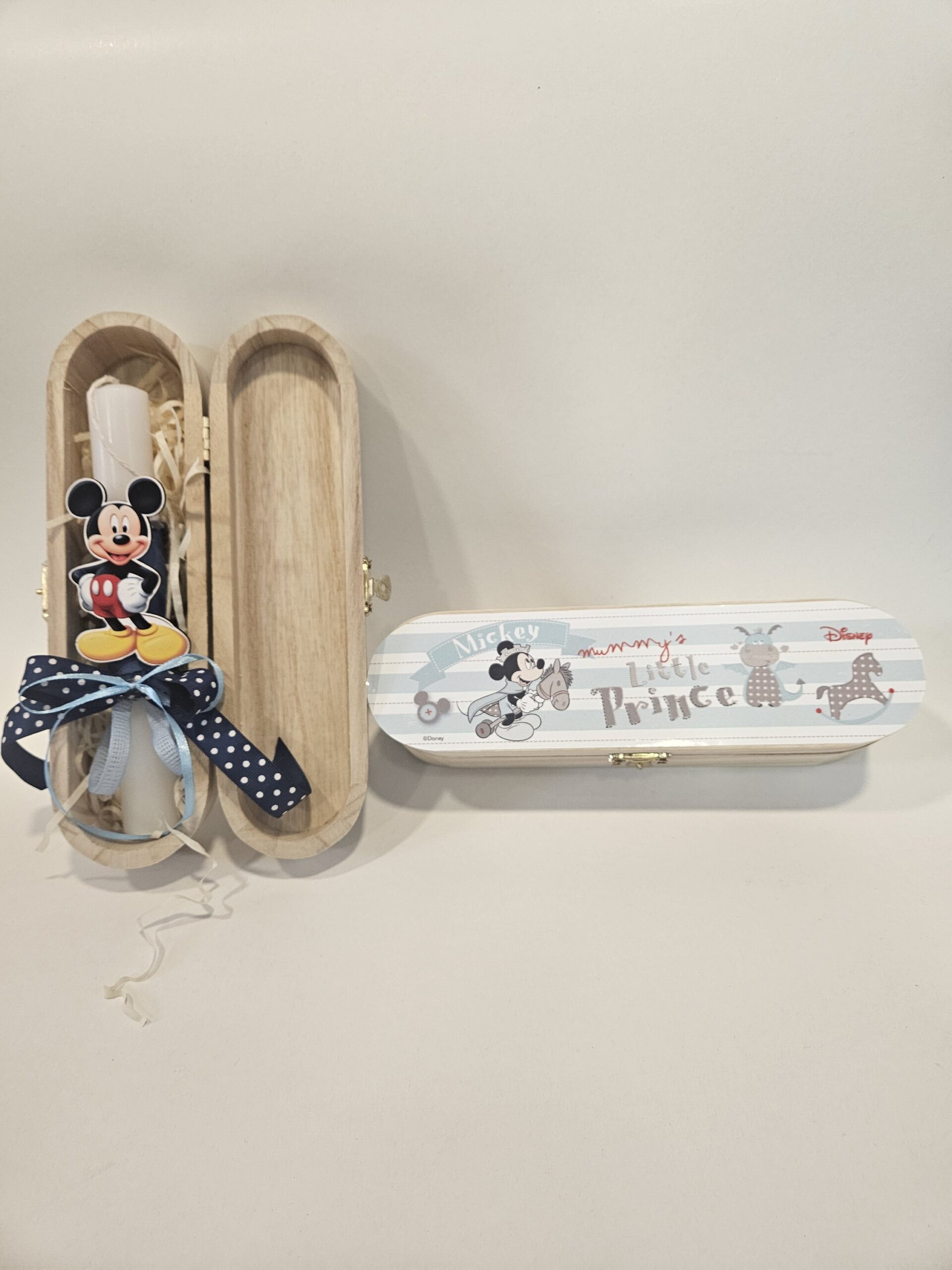 Disney ξύλινη natural κασετίνα με μεταλλικό κούμπωμα. Είναι διακοσμημένη με αυτοκόλλητο print Mickey mouse Little prince σε σιέλ αποχρώσεις .