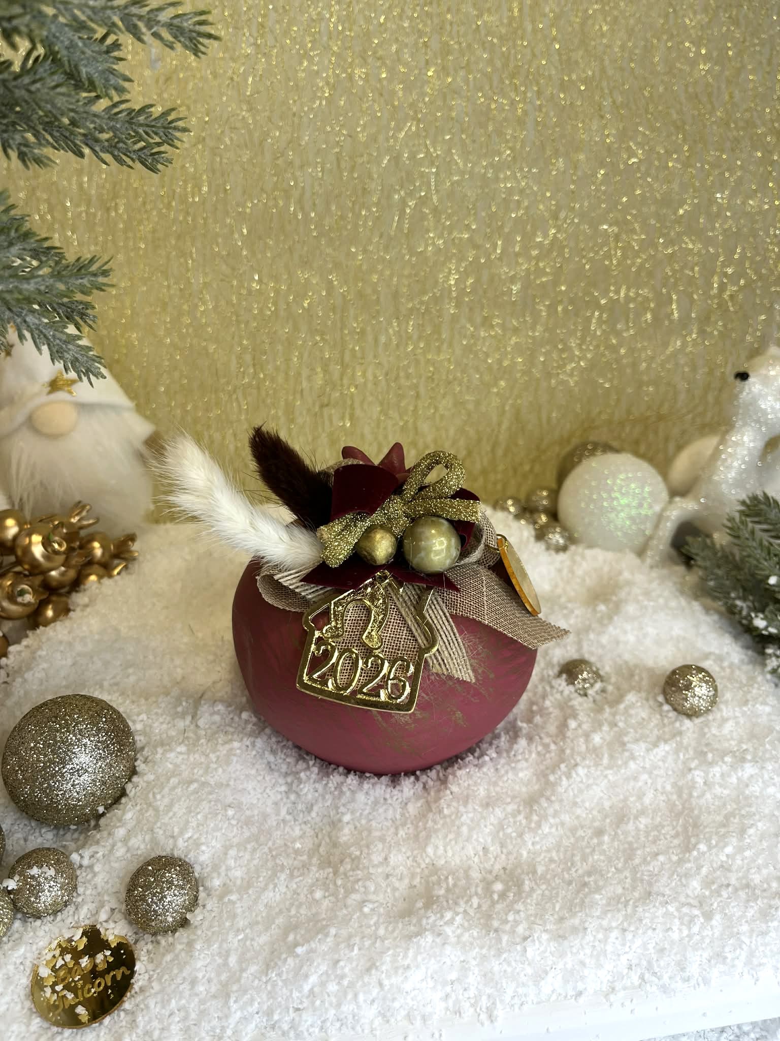 Με την κομψότητα της κεραμικής τέχνης και τη ζεστασιά του συμβολισμού του, αυτό το χειροποίητο γούρι σε σχήμα ροδιού αποτελεί ένα μικρό, καλλιτεχνικό φυλαχτό ευημερίας.