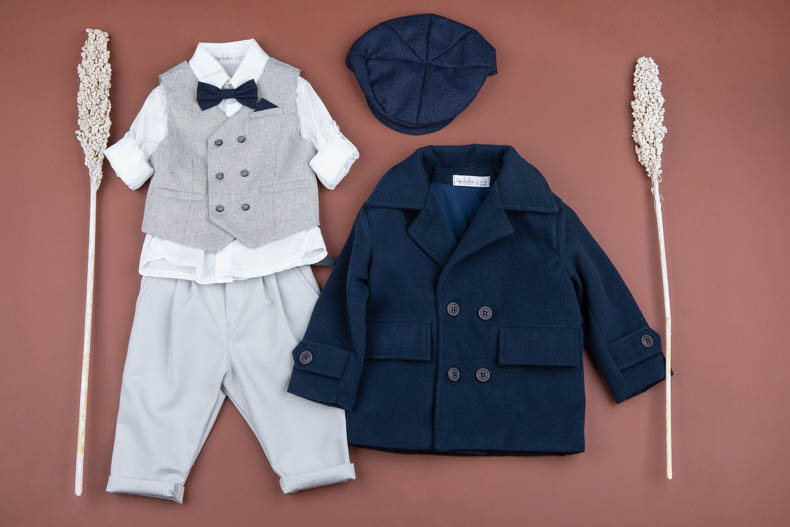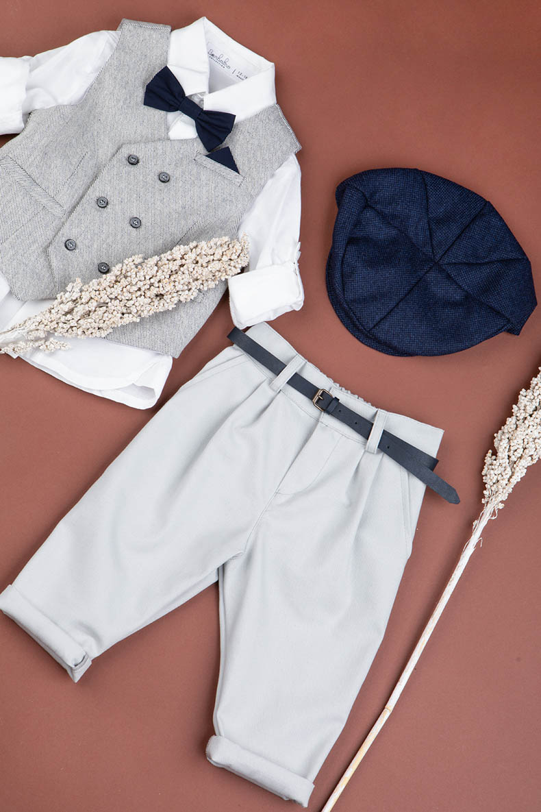 Ο Alkaios είναι το απόλυτο γκρι κοστούμι για την βάπτισή σας. Αποτελείται από γκρι πικέ παντελόνι, λευκό βαμβακερό πουκάμισο και ιδιαίτερο γκρι γιλέκο. Παπιγιόν, μαντήλι, δερμάτινη ζώνη και τραγιάσκα στις αποχρώσεις του μπλε το κάνουν απλά εντυπωσιακό και chic.