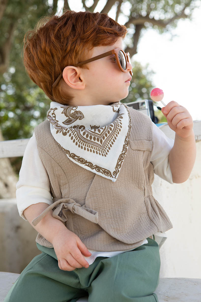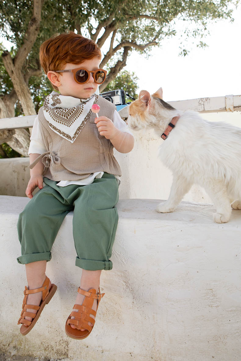 Ο Antelino είναι ένα classic but modern bambolino boy. Αποτελείται από πράσινο παντελόνι, εκρού λινό μάο πουκάμισο και μπεζ γιλέκο εξαιρετικής ποιότητας με δέσιμο. Αξεσουάρ είναι η δερμάτινη ζώνη, το φουλάρι με σχέδιο και το καβούρι του.