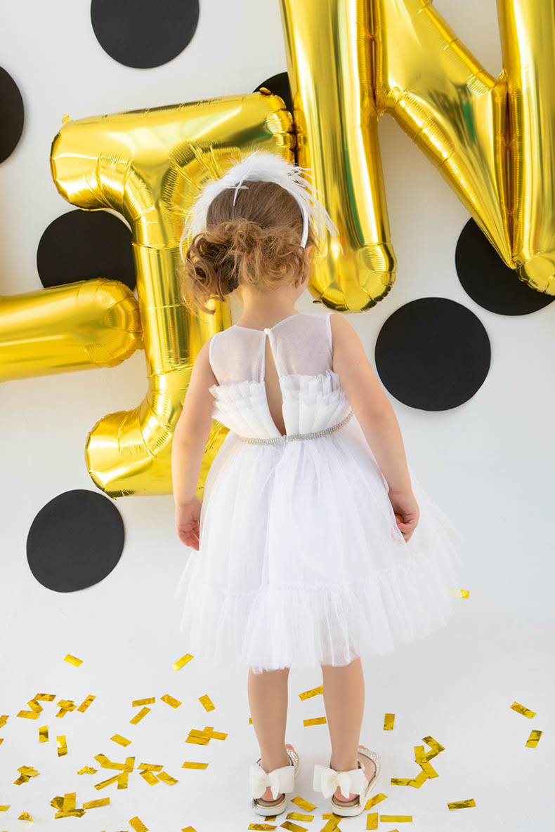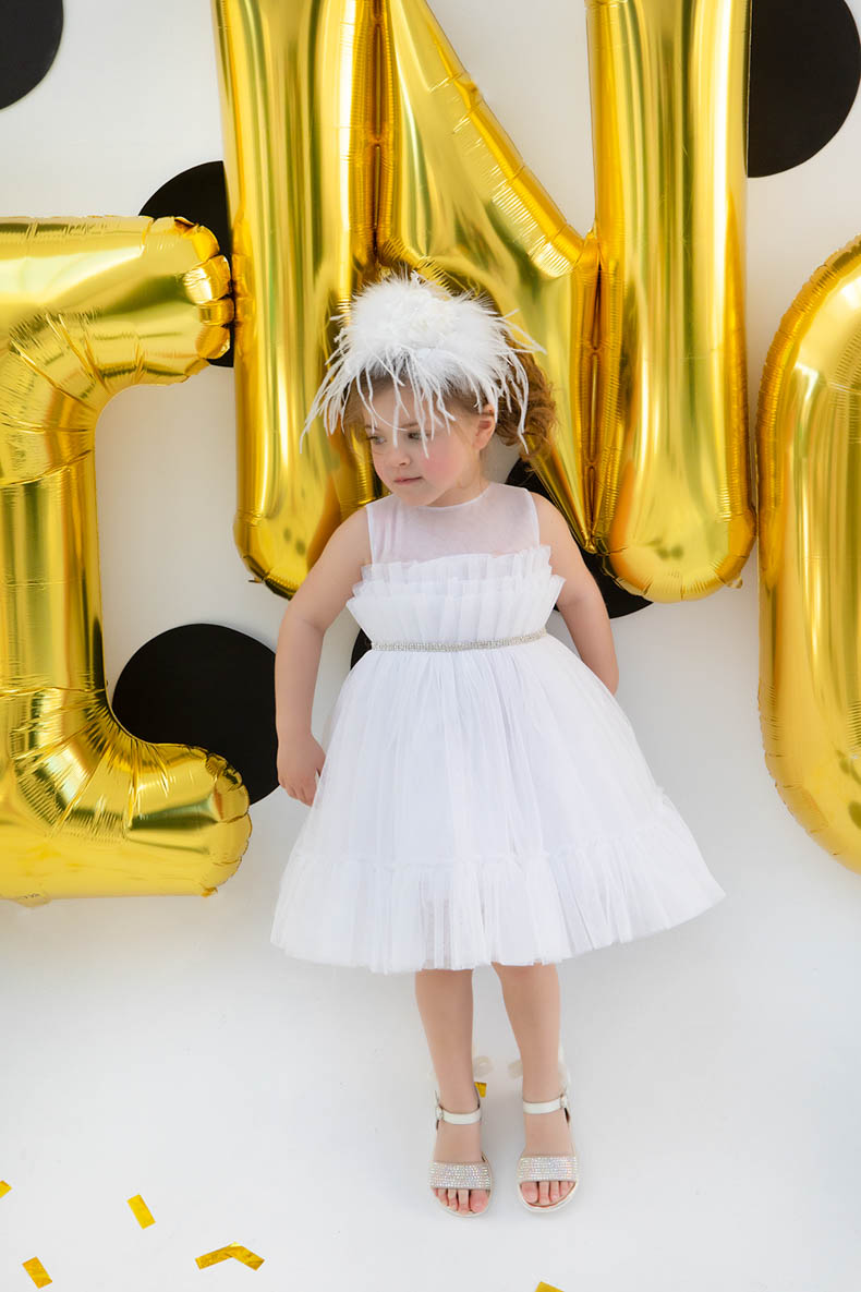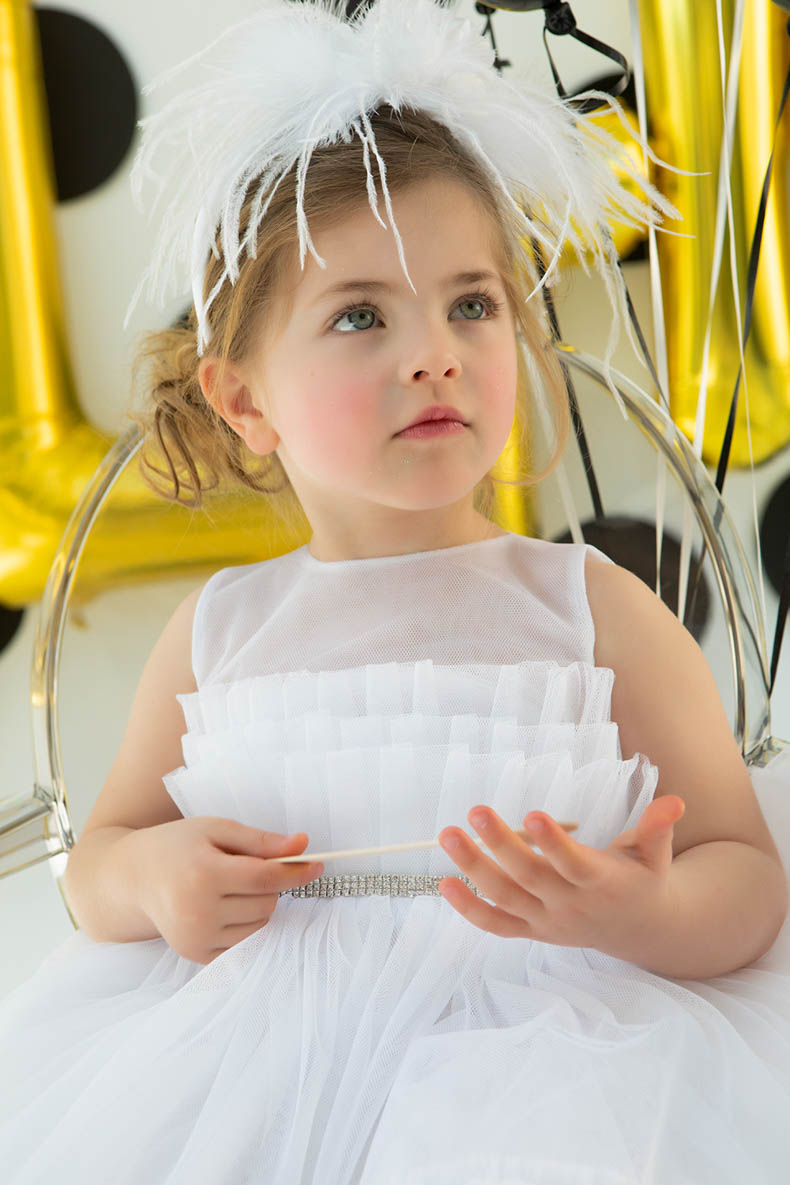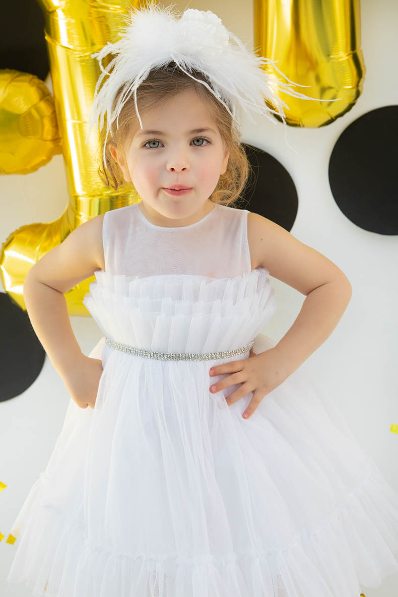 Η Crystal είναι ένα αέρινο τούλινο φόρεμα σε λευκό χρώμα εξαιρετικής ποιότητας, διακοσμημένο με petit βολάν και τρέσα με κρύσταλλα swarovski στη μέση. Συνοδεύεται για το κεφάλι με μία στέκα που την κοσμούν χειροποίητα λευκά λουλούδια με φτερά και πούπουλα exclusive κατασκευής.