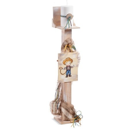 • Ξύλινος κηροστάτης-κρεμάστρα σε καφέ brush απόχρωση. Είναι διακοσμημένος με καδράκι που δείχνει το μικρό cowboy με το λάσο του και στολισμένος με λινάτασα. Στην τιμή περιλαμβάνεται και το κερί για την εκκλησία.