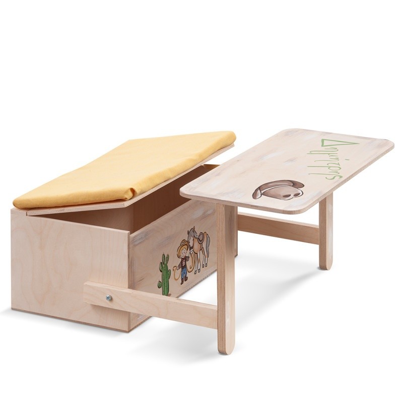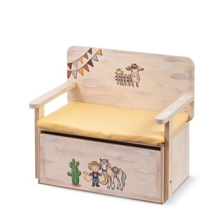 • Ξύλινο κουτί βάπτισης παγκάκι-θρανίο με κίτρινο μαξιλάρι. Το κουτί είναι σε φυσικό χρώμα με καφέ σβησίματα. Στο μπροστινό μέρος είναι ζωγραφισμένος ο μικρός cowboy με το αλογό του και στην πλάτη μία αγελαδίτσα στο ράντσο.
