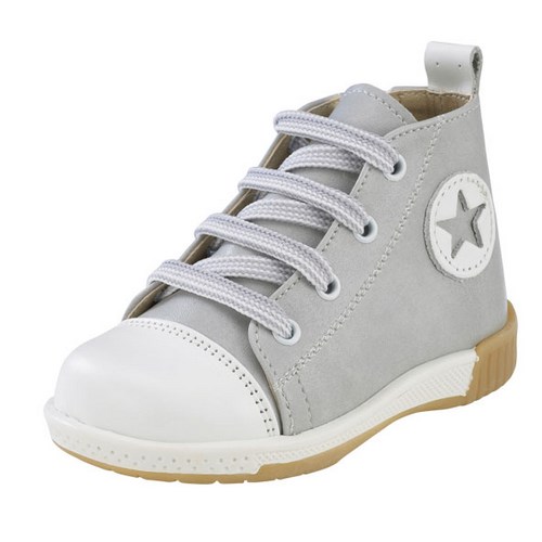 Μοντέρνο μποτάκι για αγόρι γκρι με λευκό πάτο, με κορδόνια, και σχέδιο αστέρι στο πλάι.